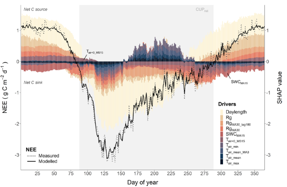 Figure showing which environmental driver affected measured daily NEE, given as SHAP values. Positive SHAP values increases CO2 losses while negative values increase CO2 uptake.
